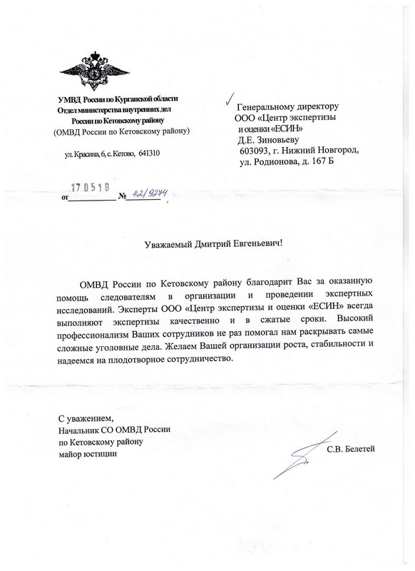ОМВД России по Кетовскому району благодарит Вас за оказанную помощь следователям в организации и проведении экспертных исследований. Эксперты ООО «Центр экспертизы и оценки «ЕСИН» всегда выполняют экспертизы качественно и в сжатые сроки. Высокий профессионализм Ваших сотрудников не раз помогал нам раскрывать самые сложные уголовные дела. Желаем Вашей организации роста, стабильности и надеемся на плодотворное сотрудничество.